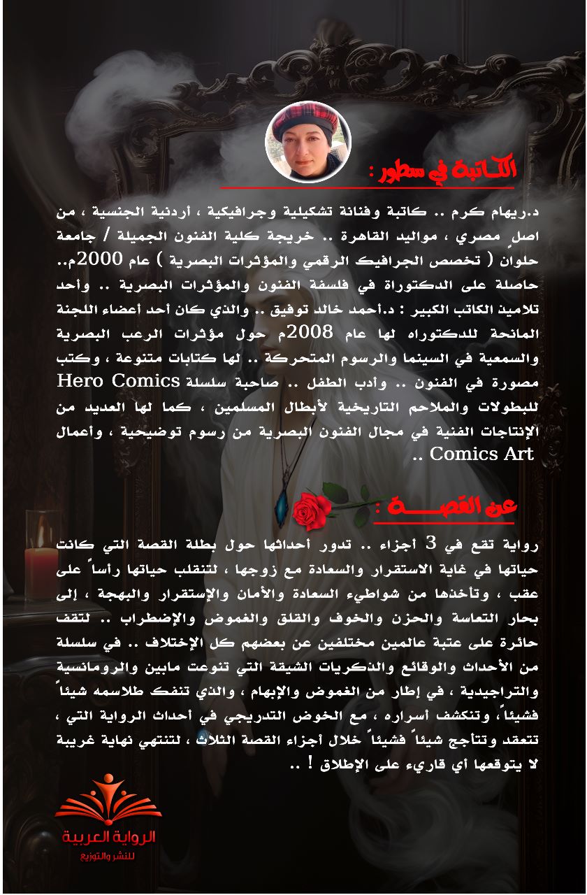 A Colored PDF E-Book of 535 pages, It revolves around the heroine of the story, whose life was very stable and happy with her husband. Her life turned upside down, taking her from the shores of happiness, safety, stability and joy, to the seas of unhappiness, sadness, fear, anxiety, ambiguity and turmoil.. to stand bewildered at the threshold. Two worlds completely different from each other.. In a series of interesting events, facts and memories that varied between romantic and tragic, in a framework of mystery and ambiguity, whose intricacies are gradually being loosened, and its secrets are revealed, with the gradual delving into the events of the novel, which are complicated and ignited little by little through parts. The three story, to end with a strange ending that no reader would ever expect!